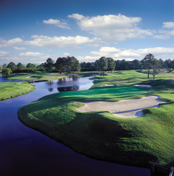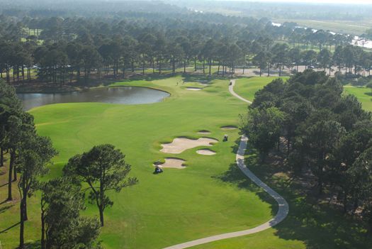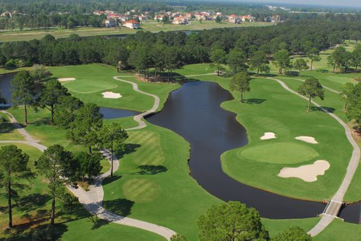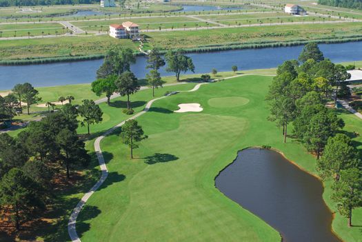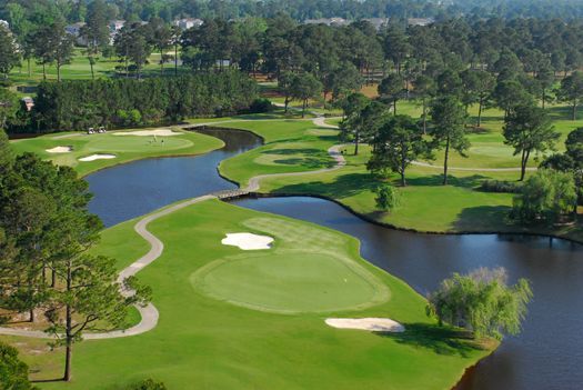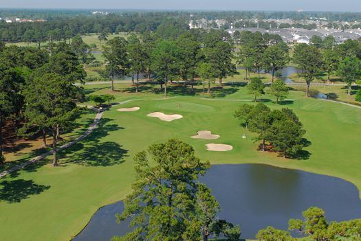 The Pinehills Golf Course at Myrtlewood is one of two eighteen hole golf courses. Both of these golf courses run parallel to the Intracoastal Waterway. The signature hole on both golf courses is #18, both are very demanding par 4’s. The Pinehills Golf Course has several dogleg fairways. The golf course is level, but the fairways have mounds that can cause uneven lies. There are also numerous sand bunkers and large trees that can alter your shots. The greens are medium speed and undulating. There are many water hazards that are marked by yellow and black flags. The back nine is more interesting than the front with sand in the fairways and at the corners of the doglegs. This golf course would be considered a good layout for the average golfer.